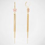 Aretes largos enchapados en oro con diseño de marco rectangular, aro de circones y cristal rosa, rematados en una cascada de cadenas. Una joya moderna, ligera y con un brillo excepcional.