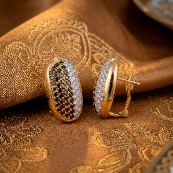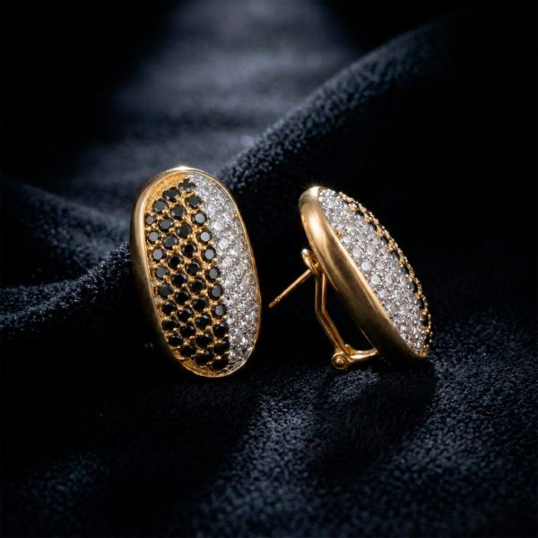 Aretes ovalados enchapados en oro con diseño de cúpula y doble pavé de circones blancos y negros. Una joya lujosa con cierre omega que ofrece un equilibrio perfecto entre elegancia y seguridad.