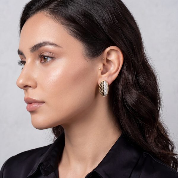 Deslumbra con estos imponentes aretes enchapados en oro, diseñados para quienes buscan una pieza de alta joyería con una presencia audaz. La pieza presenta una forma ovalada abovedada, exquisitamente decorada con un denso engaste en pavé que crea un contraste dramático. Una mitad de la superficie está cubierta por una constelación de circones negros profundos, mientras que la otra resplandece con circones blancos de máxima pureza. Para garantizar la máxima comodidad y seguridad, cuentan con un cierre de asa de presión tipo omega, que mantiene la joya perfectamente posicionada sobre el lóbulo.