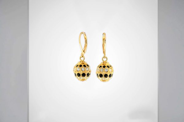 Aretes colgantes enchapados en oro de 18k con esferas brillantes decoradas con piedras negras y blancas. Una joya moderna y con movimiento.