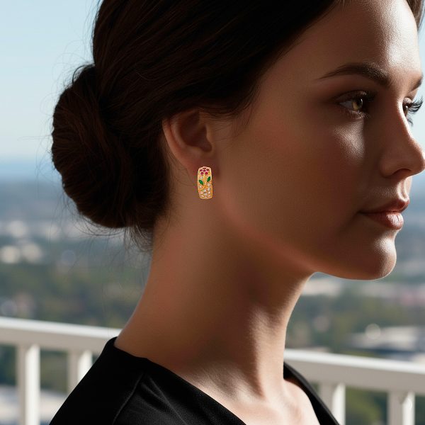 Aretes tipo argolla enchapados en oro de 18k, con diseño floral colorido y detalles brillantes. Perfectos para un look romántico y sofisticado.