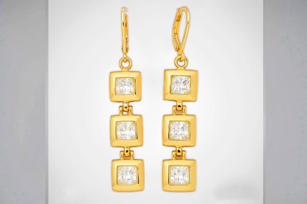 Aretes colgantes enchapados en oro de 18k con diseño geométrico de cuadros y cristales transparentes.