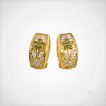 Aretes enchapados en oro de 18k con diseño floral en circonias blancas y verdes. Un toque de naturaleza para tu look elegante.