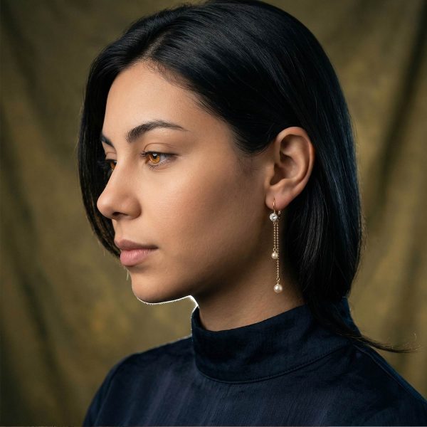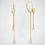 Aretes largos enchapados en oro con cristal superior, cadenas de esferas y perlas colgantes en desnivel. Una joya femenina, sofisticada y con un movimiento encantador.