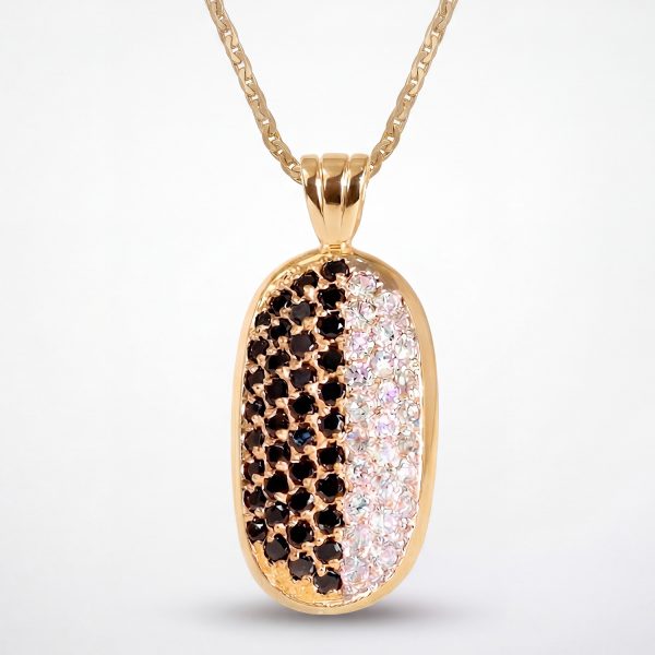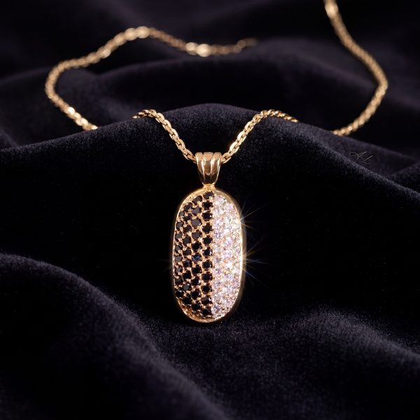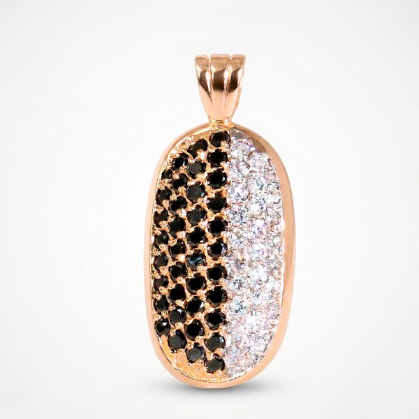 Dije ovalado abovedado enchapado en oro rosa con doble pavé de circones negros y blancos. Una joya sofisticada, de alto contraste y diseñada para ser el centro de todas las miradas.