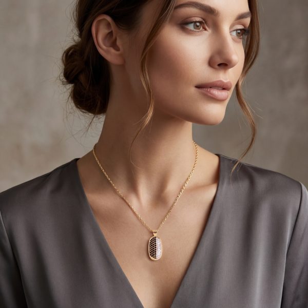 Eleva cualquier cadena con la presencia magnética de este dije ovalado enchapado en oro rosa, una pieza que personifica el lujo contemporáneo. El diseño destaca por una superficie abovedada totalmente recubierta en pavé, dividida magistralmente en dos secciones: una mitad resplandece con circones blancos de máxima claridad, mientras que la otra mitad cautiva con el misterio de circones negros profundos. Su base pulida y el pasacadena estilizado de tres líneas aseguran que el dije destaque con un brillo tridimensional y una elegancia atemporal en cada movimiento.
