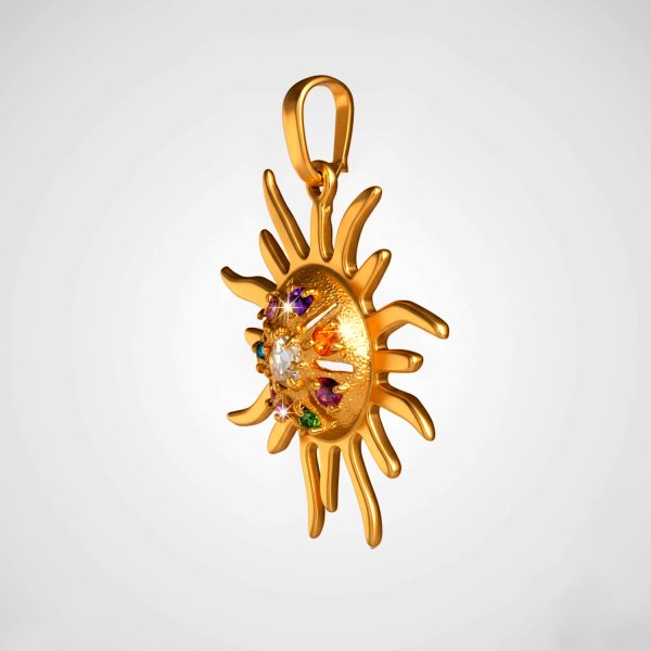 Desde esta gema cuelga un anillo circular adornado con doce cristales blancos de alto brillo, emulando un halo celestial o un disco solar, símbolo de totalidad y perfección. A su vez, tres colgantes trapezoidales móviles decorados con cristales incrustados aportan dinamismo visual, juego de reflejos y un sutil movimiento que ilumina el rostro con cada gesto.