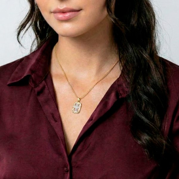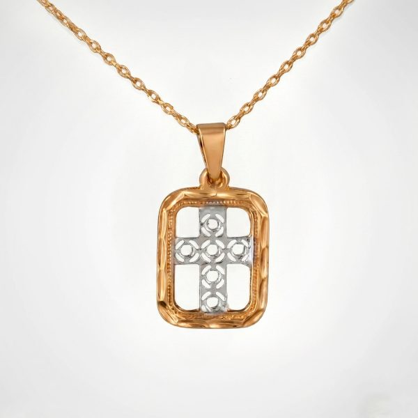 “Exclusivo collar religioso bicolor. Marco dorado con cruz interna en rodio. La combinación perfecta de metales preciosos para un look sofisticado.