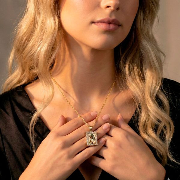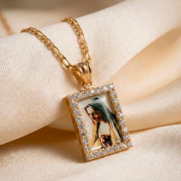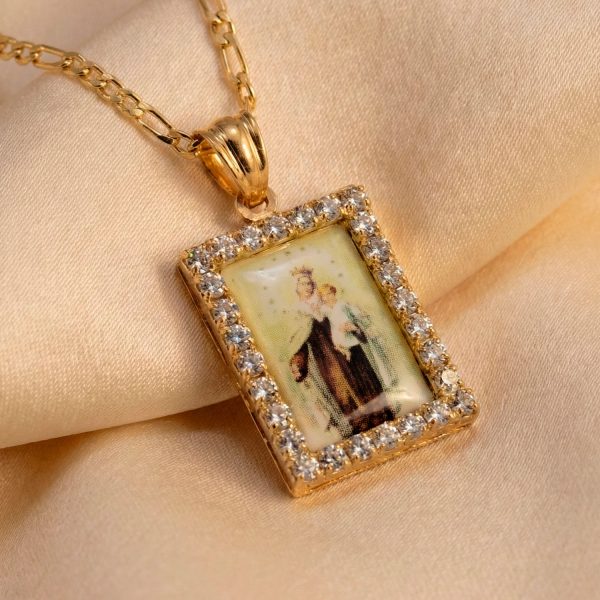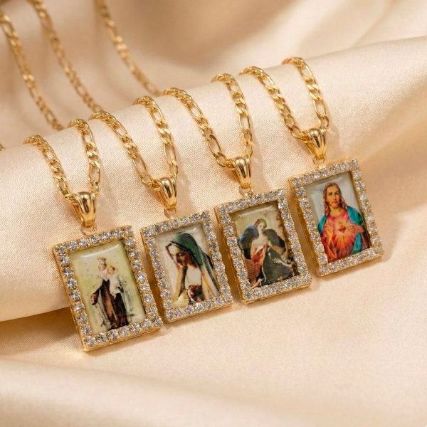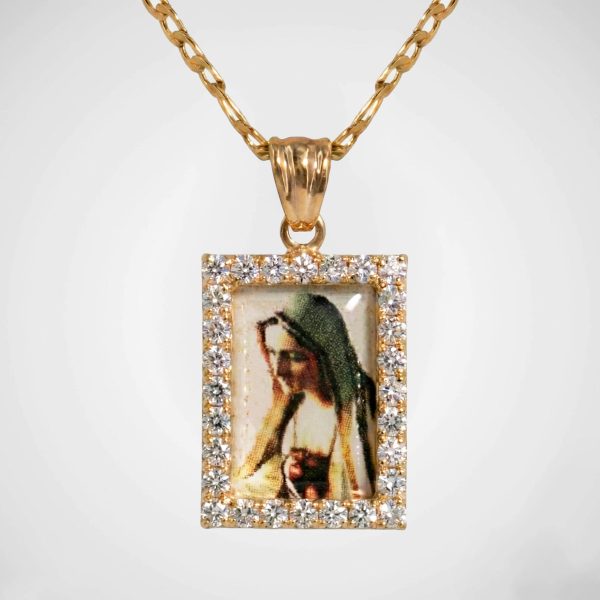 “Hermosa cadena con medalla de la Virgen y marco de strass. Un diseño religioso elegante y brillante, perfecto para uso diario u ocasiones especiales.”