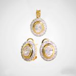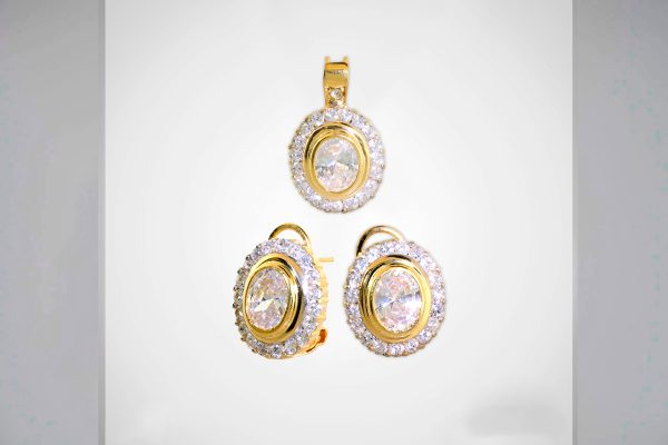 Conjunto de aretes y dije enchapado en oro de 18k, con centro ovalado tipo diamante rodeado de microcristales. Elegancia clásica para realzar tu estilo.