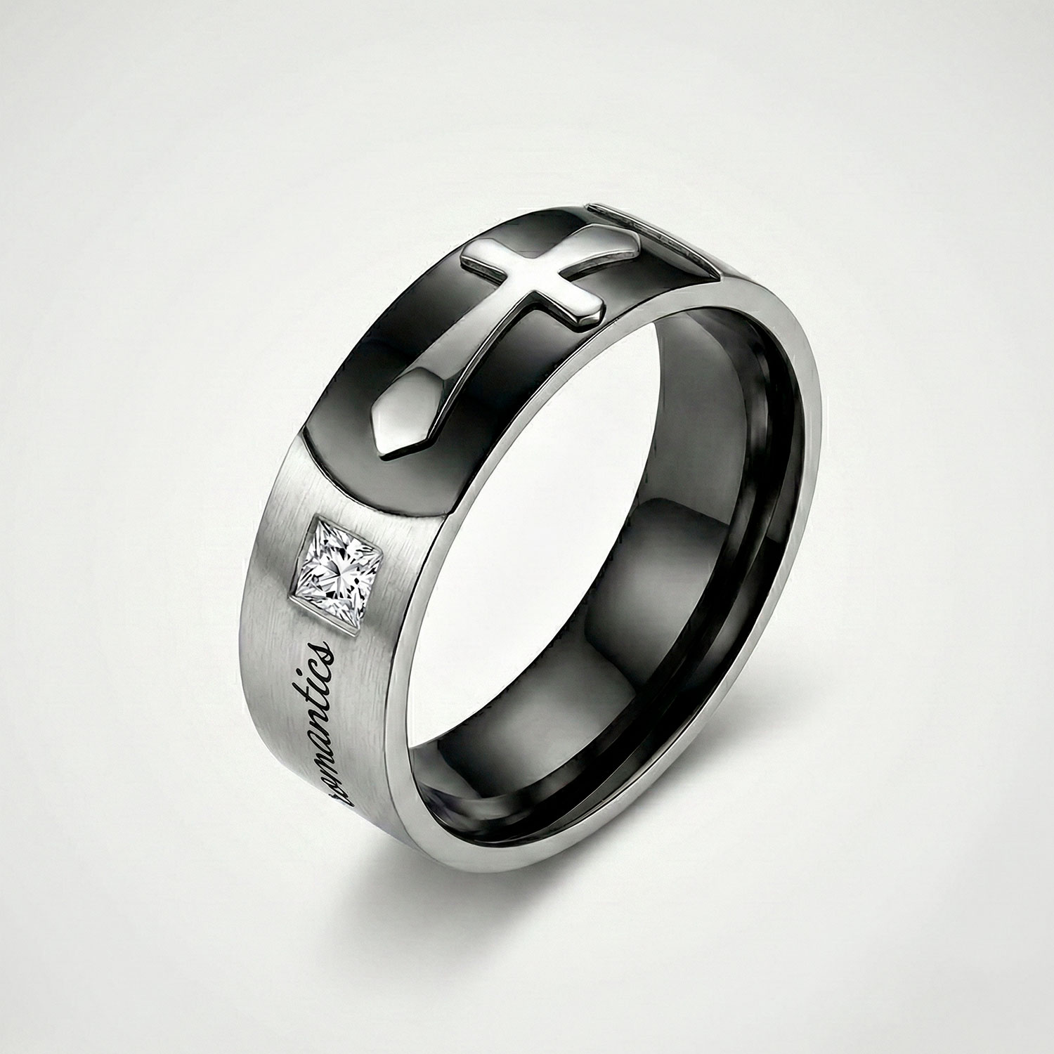 Anillo de acero inoxidable con cruz en relieve sobre fondo negro, cristal cuadrado y grabado "romantics". Un diseño moderno que fusiona fe y romanticismo.