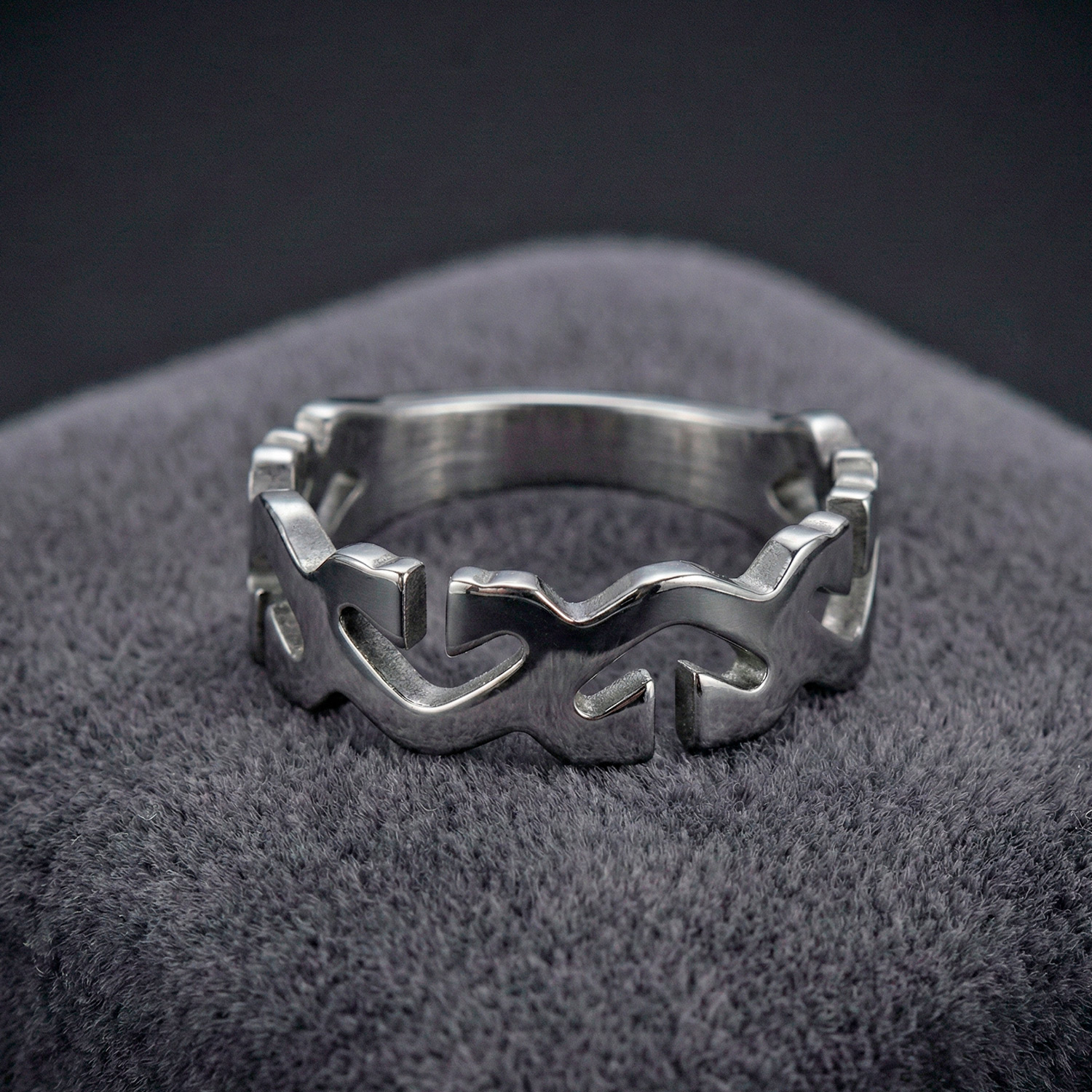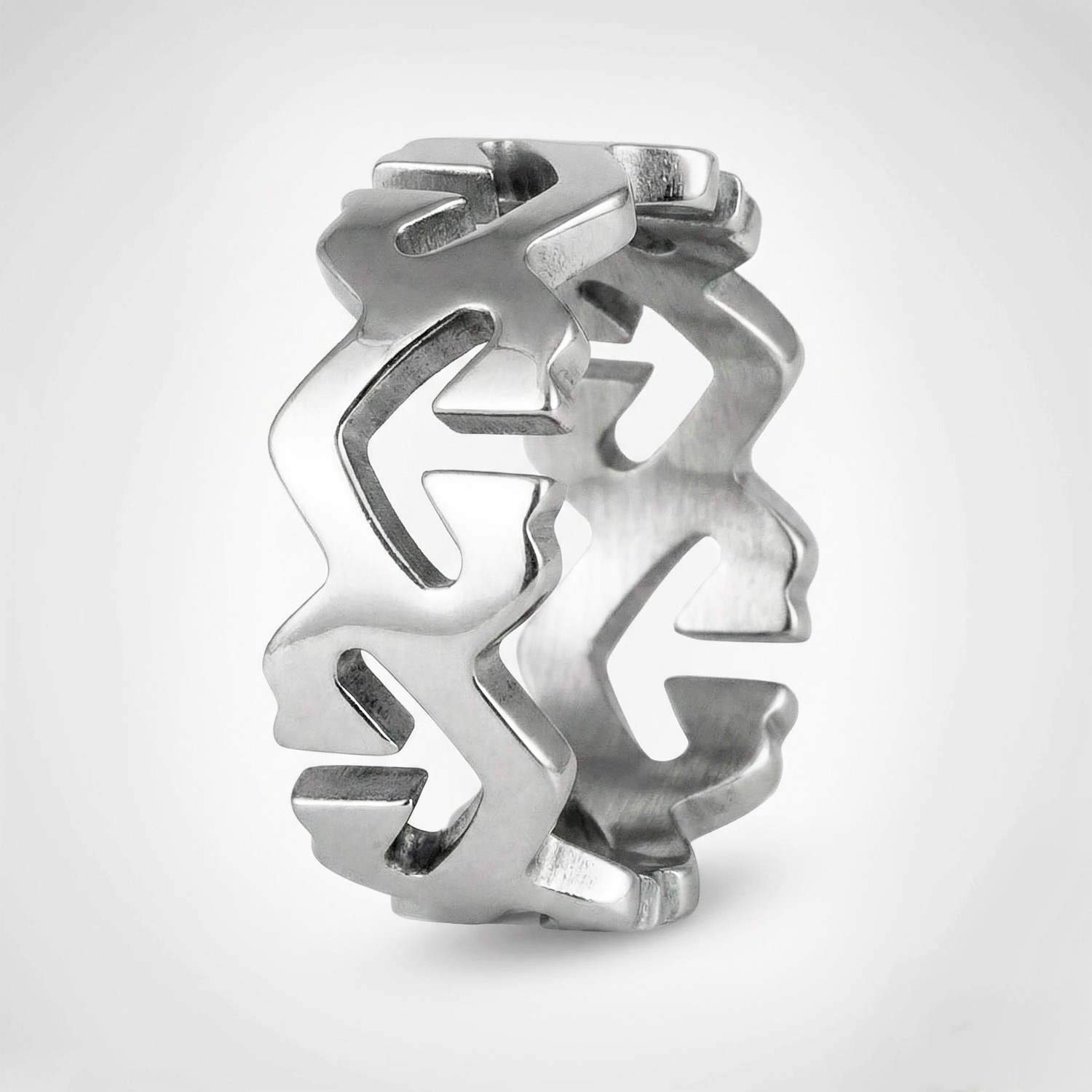 Anillo de acero con diseño calado de inspiración tribal. Una pieza moderna, ligera y con mucha personalidad para el uso diario.