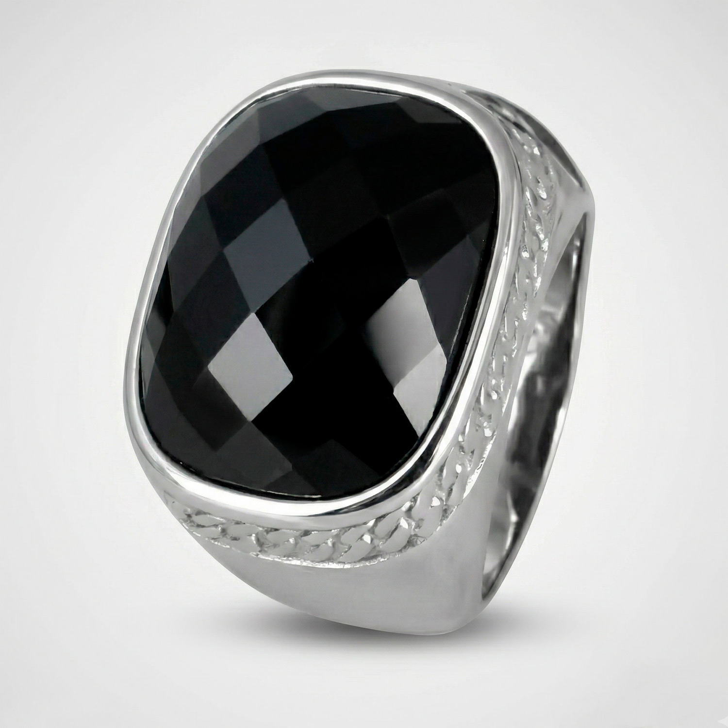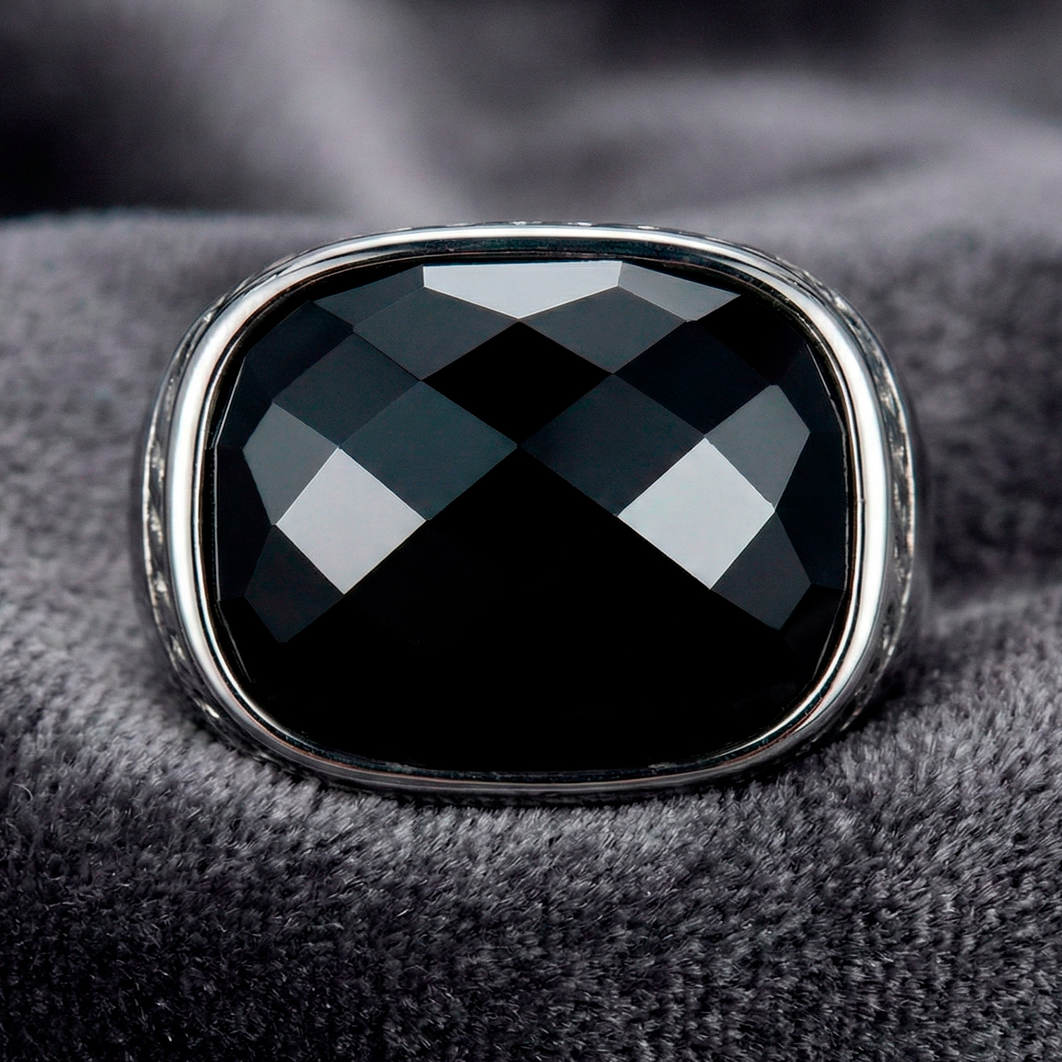 Anillo de acero con piedra negra facetada y laterales labrados. Una pieza audaz, elegante y con una presencia inigualable.