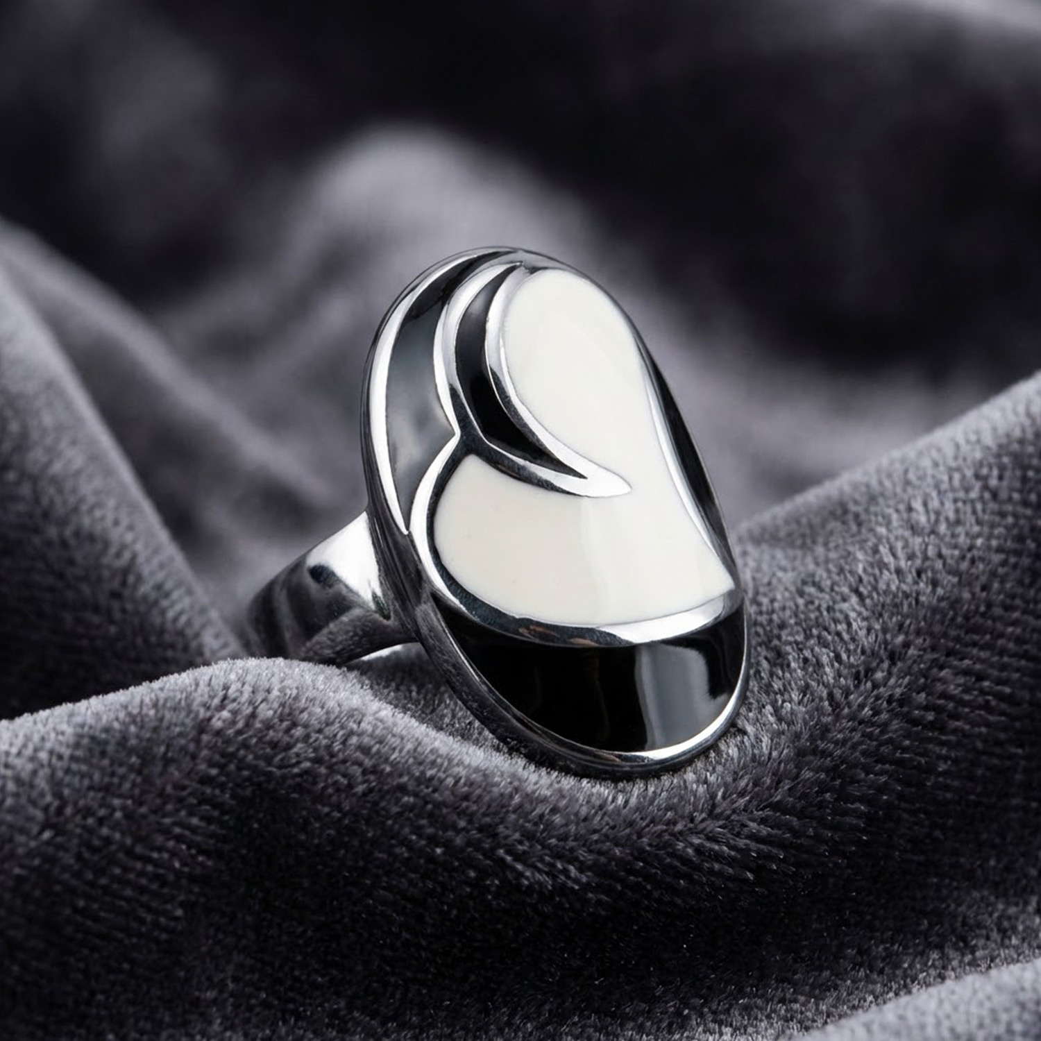 Anillo ovalado de acero con acabados en resina blanca y negra. Un diseño artístico de gran volumen con un estilo contemporáneo único.