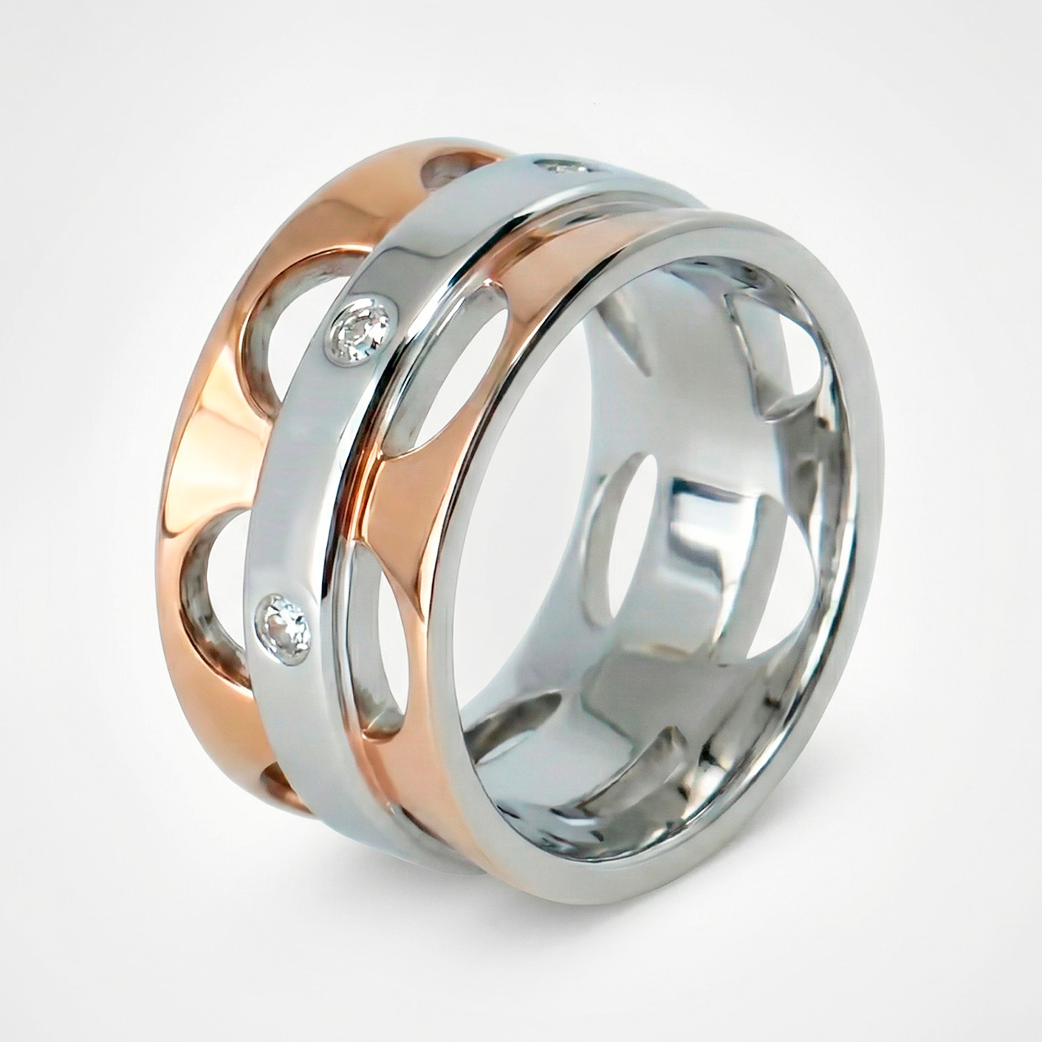 Anillo ancho de acero bitono con superficie en pavé de cristales y acento dorado curvo. Un diseño lujoso y moderno para destacar.